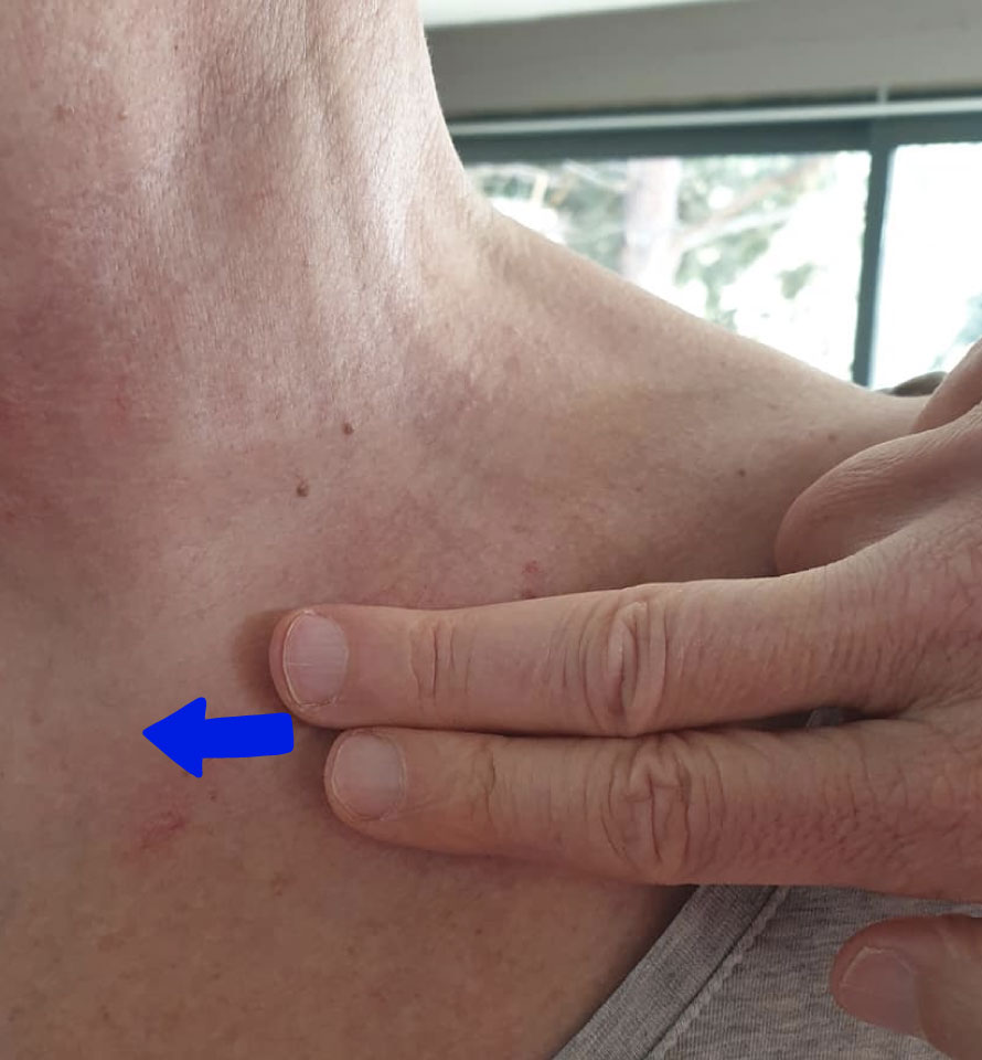 Varias pruebas son posibles; dan el mismo resultado. Entre ellos, la interrogación transversal horizontal de la epidermis (superficie) a nivel de la articulación esternoclavicular (foto 1).