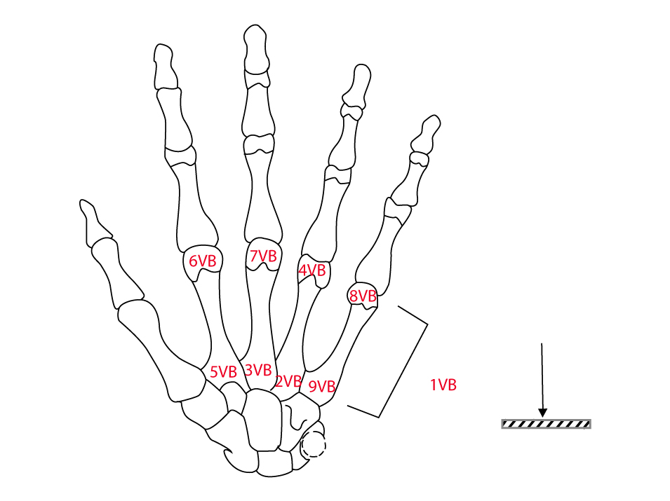 La búsqueda del Vaso Maravilloso Perturbado se llevada a cabo mediante la interrogación vertical a nivel óseo de la cabeza y la base de los últimos 4 metacarpianos (foto 2). A la palpación, el punto correspondiente se cierra.