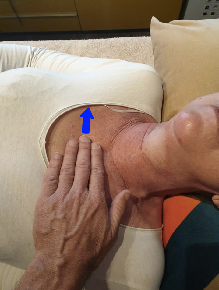 La coreccion se efecua con une mano del terapeuta en el centro del meridiano de Bazo, a la altura del el hemitórax DERECHO, su otra mano busca el punto conectado al cento en el meridians de Bazo del lado del bloqueo, del 1B al 11B (los puntos 10B y 3B son los mas frecuentes) (foto 3).