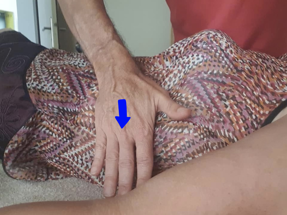 - Confirmación por interrogatorio transversal en la superficie con la palma de la mano sobre la superficie lateral del hemitórax IZQUIERDO, a nivel del órgano del bazo (foto 5).