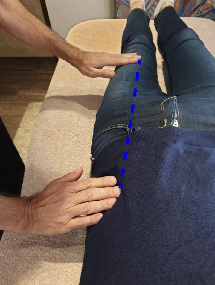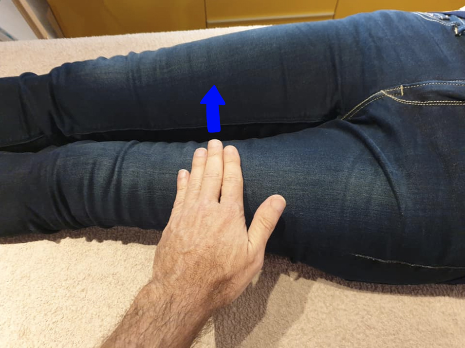 El control general de la cadena del bazo se lleva a cabo mediante la interrogación transversal horizontal de la epidermis en el centro de la superficie anterior del muslo (foto 1).