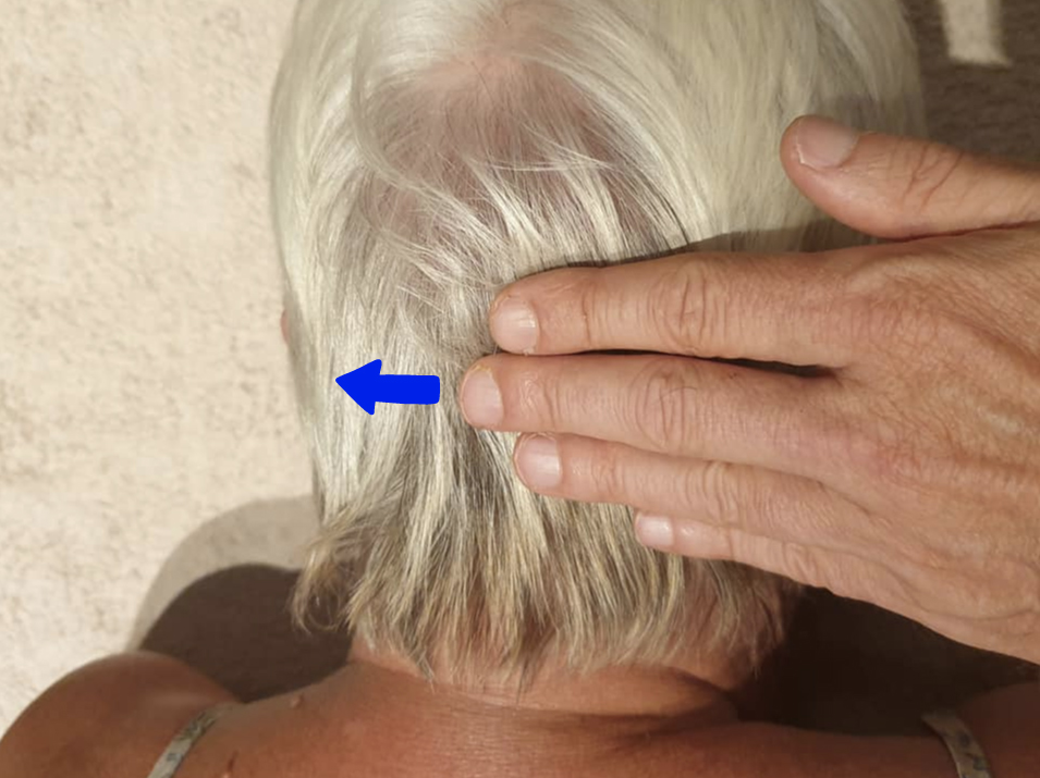 La corrección se realiza con una mano sobre el « centro occipital » (occipital-C1-C2) (foto 5), la otra mano sobre el punto correspondiente del órgano alterado o víscera. Una forma sencilla de determinar si es el órgano o la víscera del Elemento que está afectado, es palpar su punto correspondiente. El terapeuta guarda al que está cerrado (que no responde).