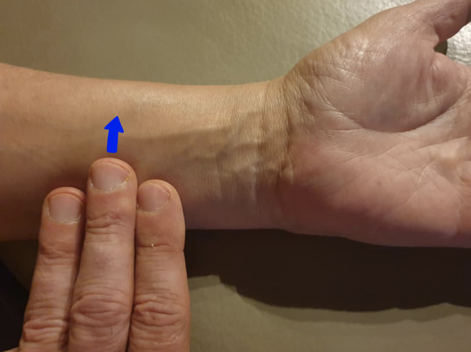 - Interrogación transversal en la superficie del canal cubital (nivel proximal). La foto 3 muestra la posición de los dedos en los compartimientos de agua-madera-fuego de izquierda a derecha.