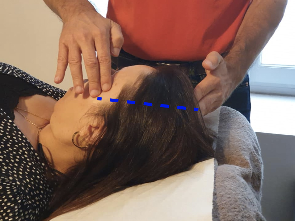 La corrección se realiza con una mano en el punto, la otra buscando un área específica conectada al punto en la región del vértice (parte superior de la cabeza) (ver foto 2).