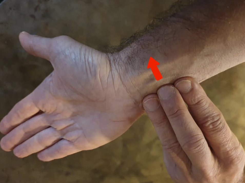 El control específico se lleva a cabo mediante la interrogación vertical a nivel óseo de la cabeza (foto 1) y de la base del 5º metacarpiano (M5). La cabeza M5 está relacionada con el punto de comando cefálico del Du Mai (8VB) y la base M5 con el punto de comanda del Ren Mai (9VB, Ben Shen, actual 13VB). Si la cabeza y la base de M5 están bloqueadas, el enlace Ren Mai – Du Mai se interrumpe. Confirmación por palpación del 1VB (el punto esta « cerrado » – ver capítulo I).