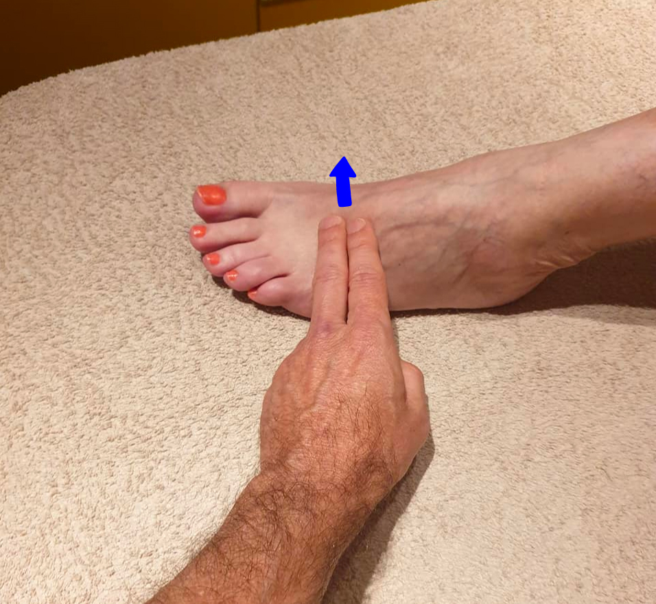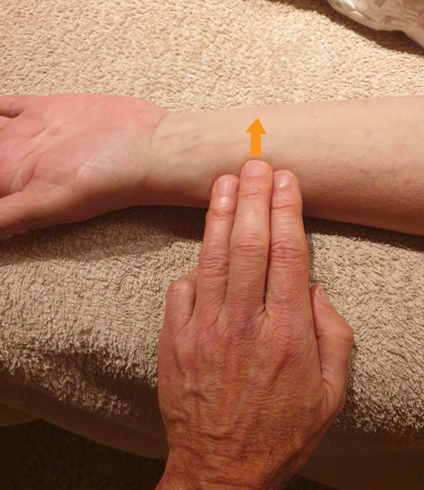 Se lleva a cabo mediante la interrogación transversal del radio en el canal radial por encima de los pulsos radiales, manteniendo la misma distribución de los diferentes compartimentos Agua, Madera, Fuego.. (foto 3). Para averiguar qué órgano o víscera en el compartimento está perturbado, el terapeuta palpa los puntos Mu correspondientes. El punto se cierra (no responde a una interrogación vertical en la superficie).
