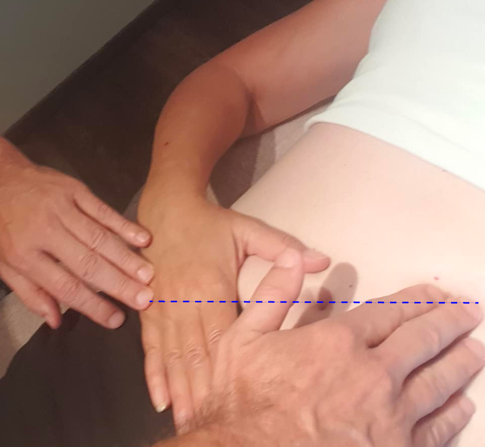 El terapeuta palpa mediante un interrogatorio vertical en la superficie los diferentes puntos del meridiano del TR en el lado bloqueado en el control global (1TR, 2TR y 3TR son frecuentes). Mantiene una mano en este punto y busca con la otra un área ubicada en la parte superior e izquierda del ombligo conectado al punto. Esta área corresponde anatómicamente a la cisterna de Pecquet, un elemento importante del sistema linfático (Foto 2).