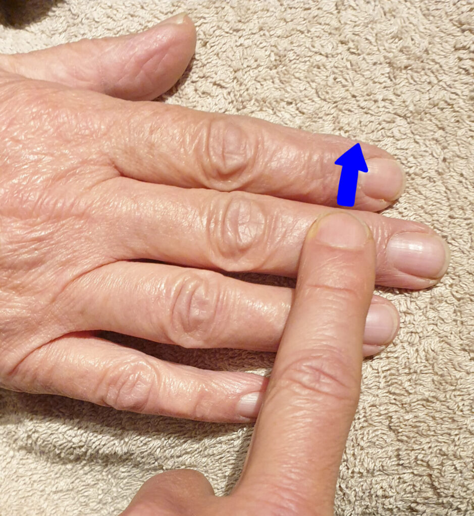 Confirmación por interrogación de superficie transversal en la cara dorsal de la articulación interfalángica distal del 3er dedo (foto 2).