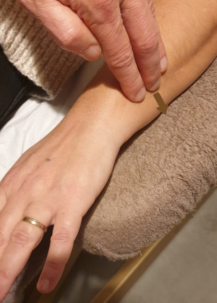La búsqueda se lleva a cabo mediante la interrogación ósea transversal del canal cubital, a nivel proximal, (es decir, por encima de los pulsos radiales) (foto 3)