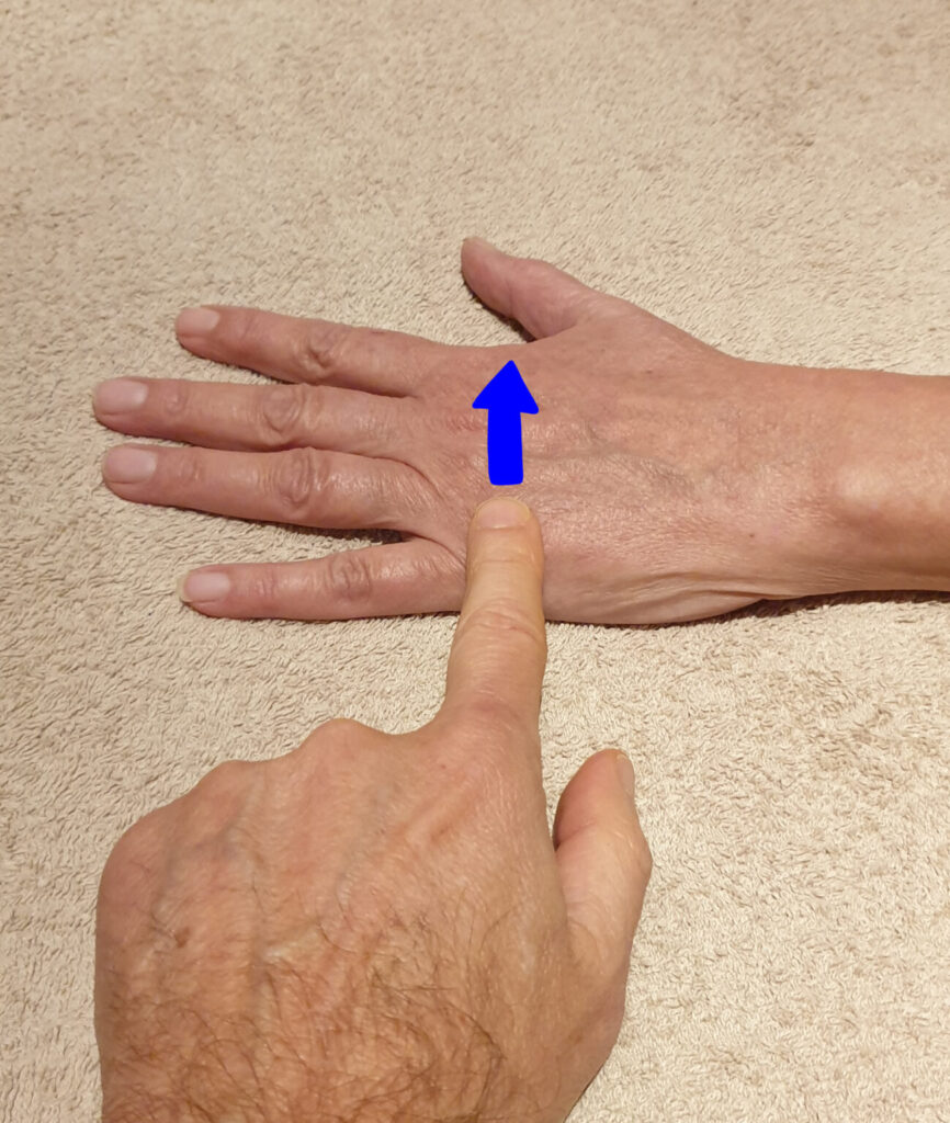 Se lleva a cabo mediante un interrogatorio transversal horizontal en la superficie (epidermis) de la cara plantar del antepié (en el área del punto 1R), con 3 dedos planos (foto 1).