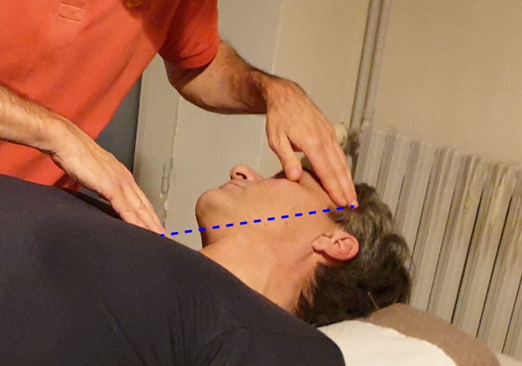 Con una palpación superficial, desde la mano hasta la planta del pie, el terapeuta busca con la otra, un área en la mitad superior del esternón conectada a la 1ª mano (foto 3).