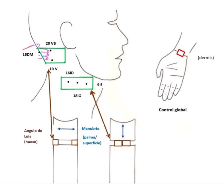 – una banda superior, en la base del cráneo, por lo tanto posterior, desde la línea media (DM 16) hasta el proceso mastoideo del hueso temporal. En esta banda se incluyen 16DM, 10V, 20VB, 16TR puntos.