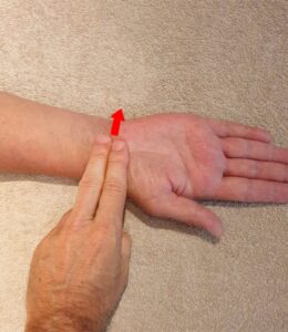 Indica al terapeuta si al menos 1 punto « Ventanilla del Cielo » esta cerrado. Se efectua mediante un interrogatorio transversal a nivel de la dermis en el medio del pliegue de flexion anterior de la muñeca (en la zona 7MC), a la izquierda y a la derecha (foto 1).