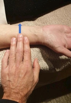 Se realiza mediante la interrogación transversal de la epidermis de los diferentes compartimentos Agua, Madera, Fuego… En el canal radial pero por encima (hacia la raíz de la extremidad) de la posición de los dedos al tomar el pulso, manteniendo la misma distribución de los compartimentos (foto 2).