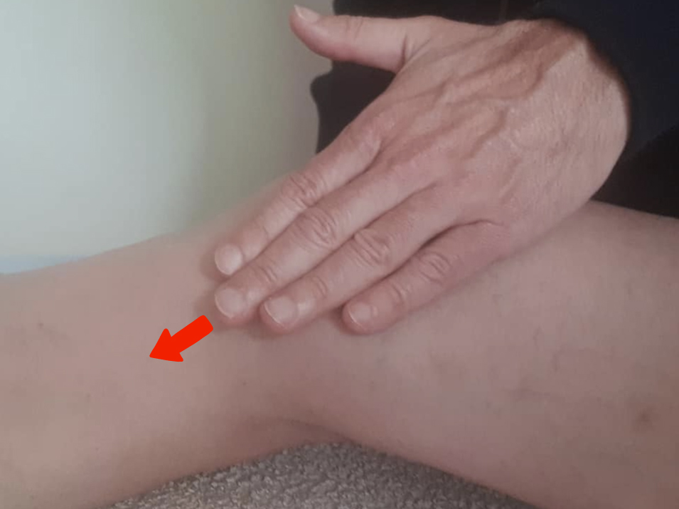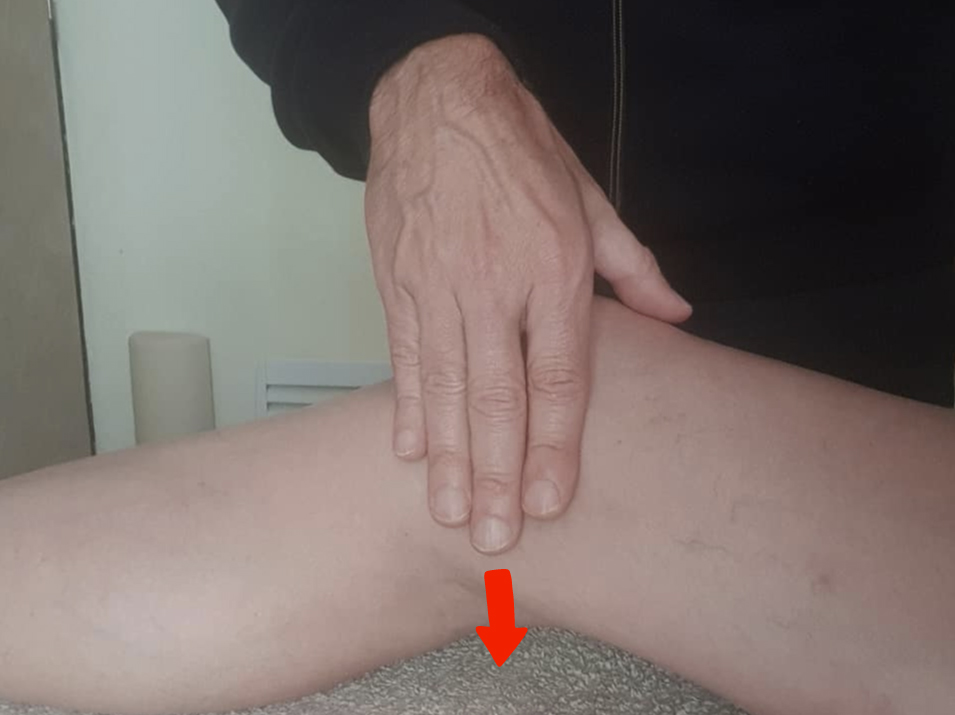 Tomamos el ejemplo del control de los clásicos puntos Yu (Shu) (llamados Yu de Jing Bie) en la dermis de la cara interna de la rodilla (foto 1): al estar relacionado con una perturbación en los puntos Yu, el bloqueo en la dermis debe desaparecer si el terapeuta cambia la dirección del impulso como por ejemplo en las fotos 2 y 3.