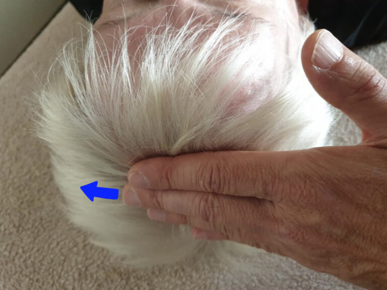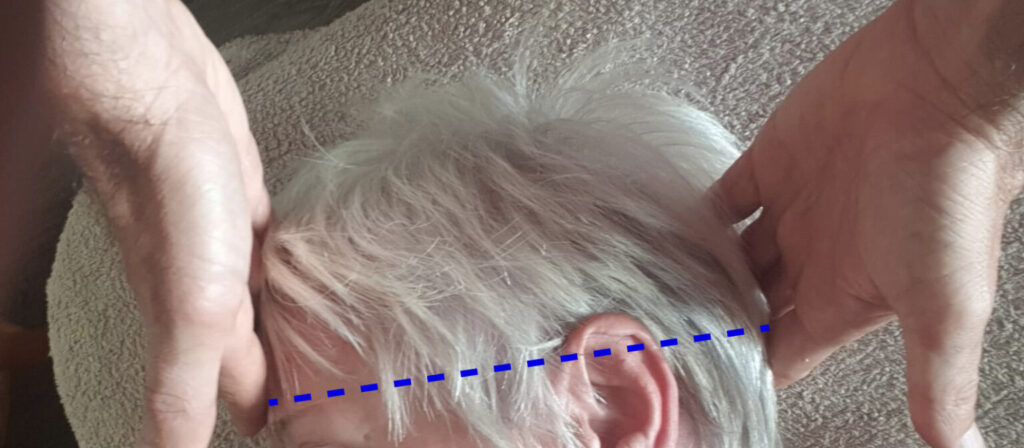 El control del centro se lleva a cabo mediante el interrogatorio transversal en la superficie (epidermis), con los 4 dedos planos, de la parte superior de la cabeza (foto 1). Podemos interrogar los lados derecho e izquierdo del centro. Un bloqueo indica una interrupción en al menos 1 cadena o generador cefálico.
